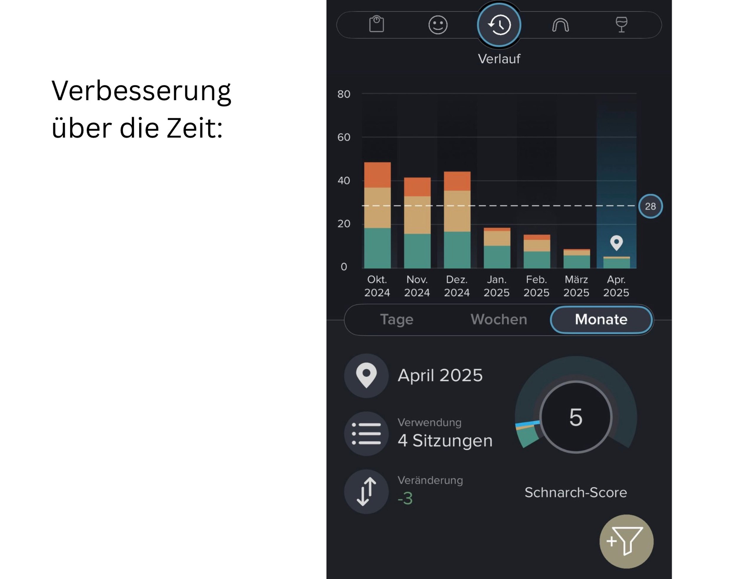 Hier noch ein Screenshot zur Verbesserung über die letzten Monate: Ich habe den Vorschub der Schiene immer besser angepasst, sodass mein Schnarch-Score mittlerweile nur noch bei 5 liegt.